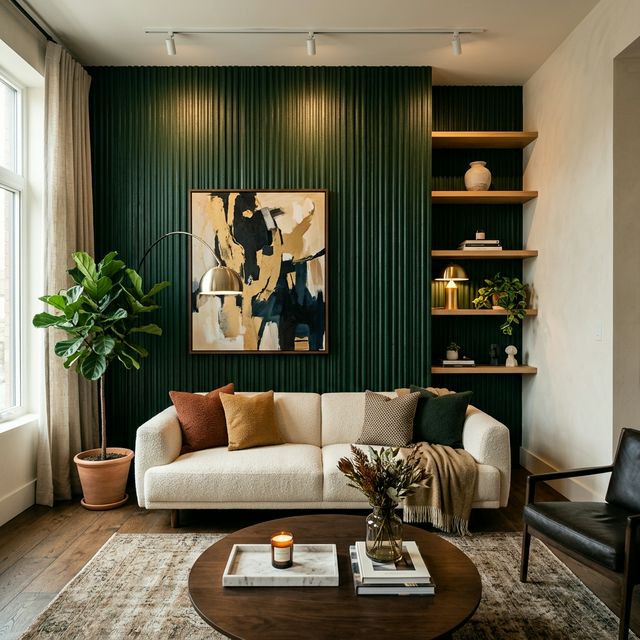 - สีเข้มตัดห้อง — ทาสีเข้มเพียงผนังเดียว (เขียวเข้ม น้ำเงิน เทาเข้ม) สร้าง Depth
